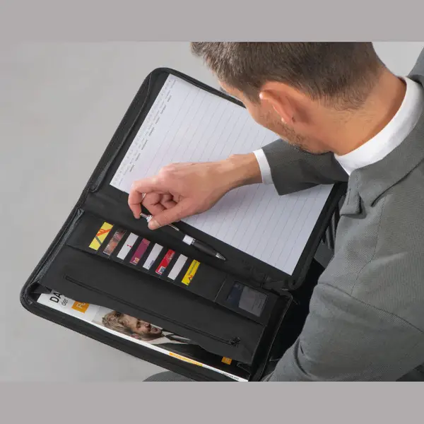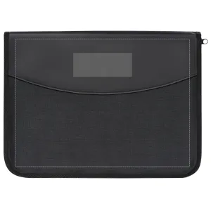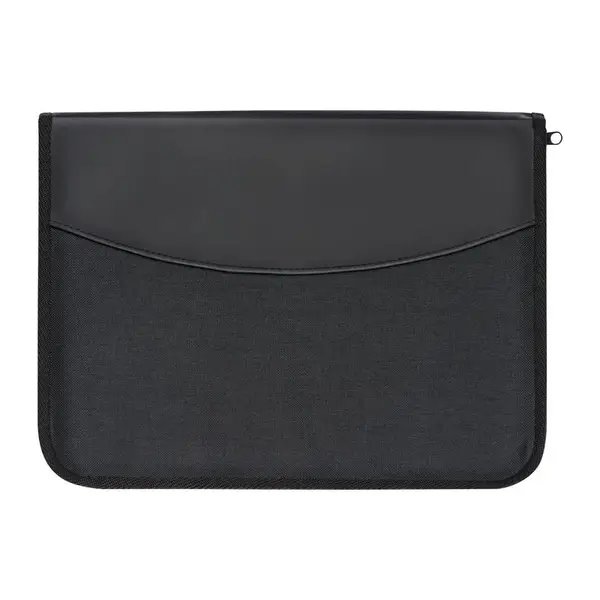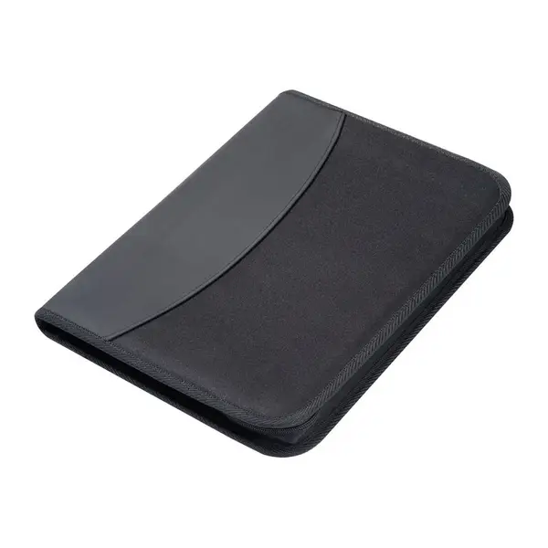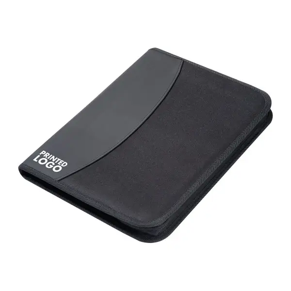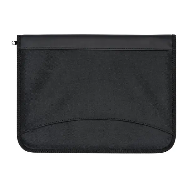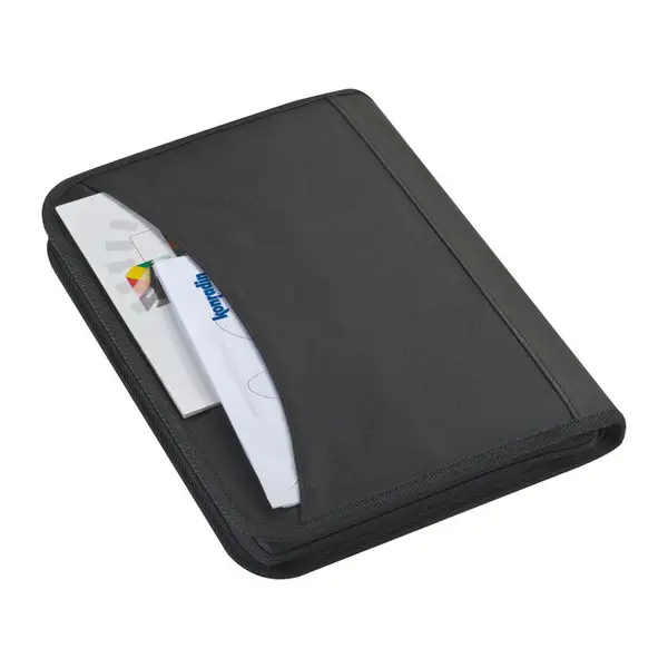600D poliészterből készült konferencia mappa notesszel, sima és cipzáras kialakítású belső rekesszel, névjegytartókkal, A4-es jegyzettömbbel.