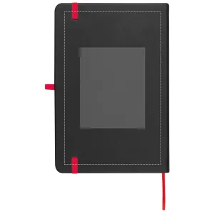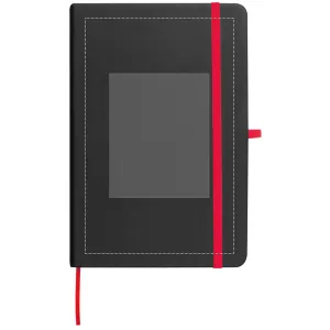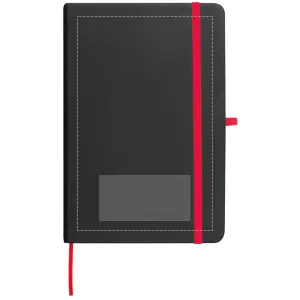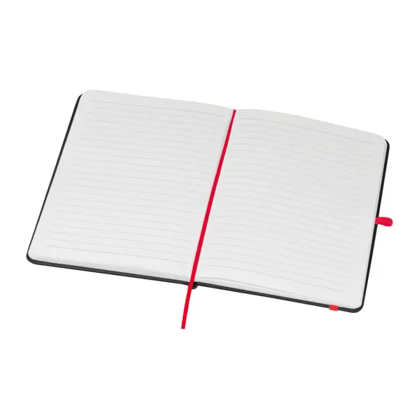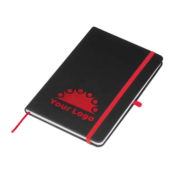 A5 méretű jegyzetfüzet PU borítóval, 192 vonalas oldallal, színes könyvjelzővel, tolltartó hurokkal és gumiszalaggal. A gravírozás színe megegyezik a gumiszalagéval.