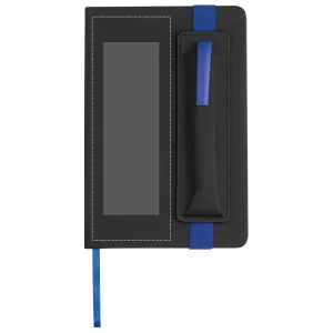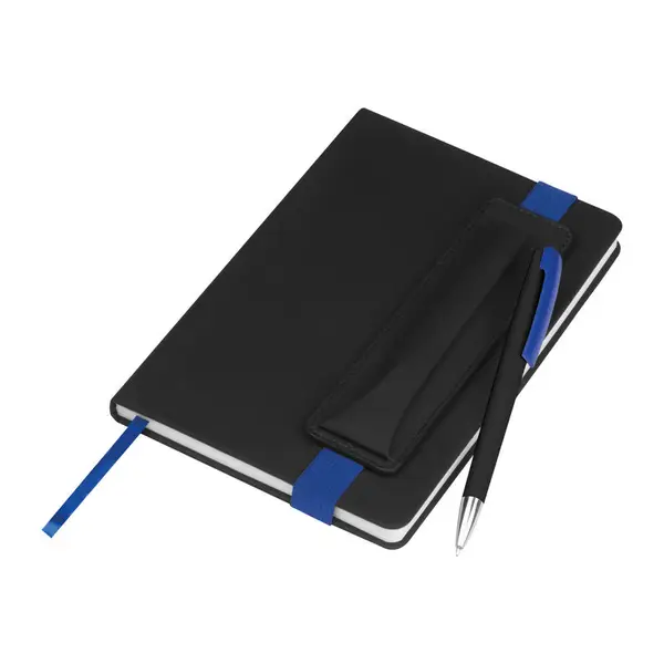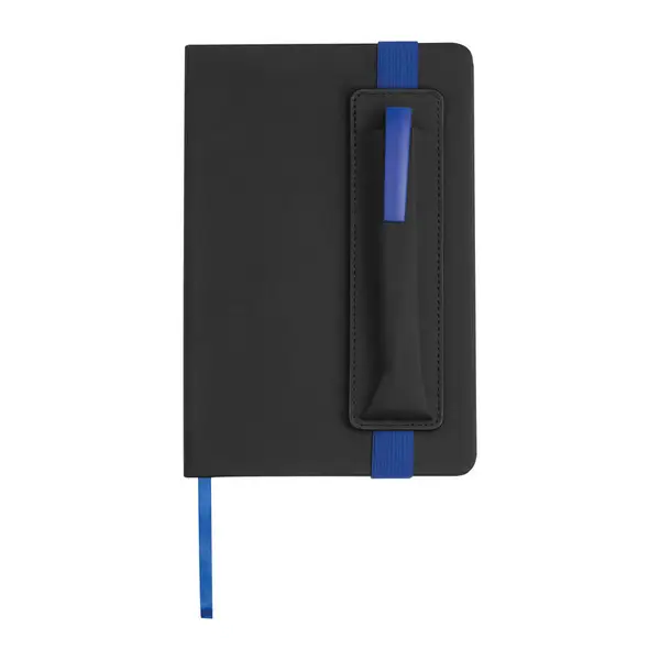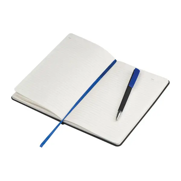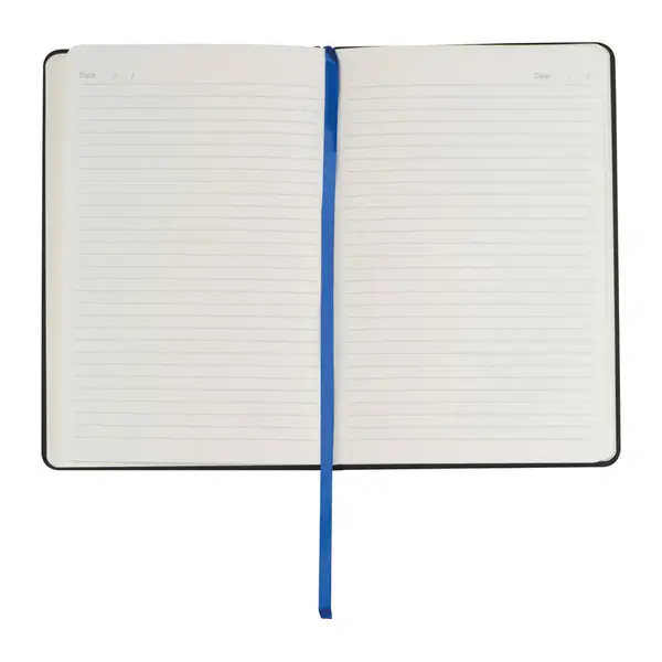 A5 méretű elegáns notesz PU borítással, 192 vonalas oldallal, könyvjelzővel és tolltartóval.