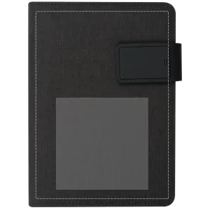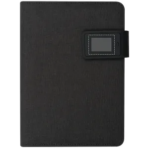 128 oldalas A5 notesz, beépített 4000 mAh-es külső akkumulátorral, tároló zsebekkel, tolltartó pánttal, mobiltartóval és USB töltőkábellel. A termék érdekessége a gumírozott mágneses zár, színes LED-es világítással, így a logó világítani fog!