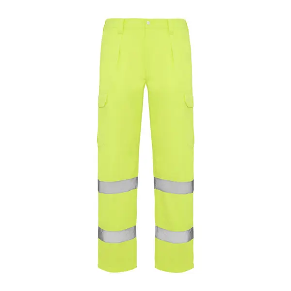 Jó láthatóságot biztosító, fluorsárga hosszú nadrág. · Hátul állítható, elasztikus derékpánt.· Elöl két zsebbel. · Hajtókás farzseb, tépőzárral. · Két réselt oldalzseb sarkakkal és tépőzáras hajtókával. · Két vízszintes fényvisszaverő szalag.