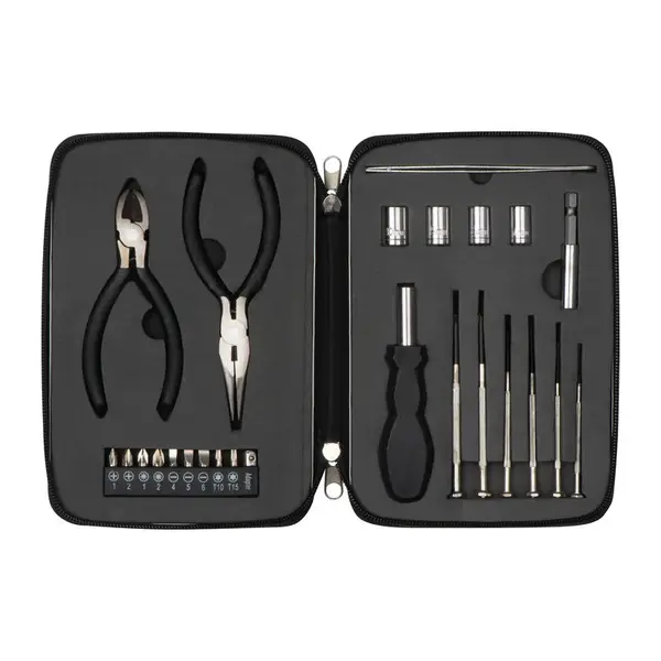 Úton, vagy otthon is jól jöhet ez a 25 db-os alumínium szerszámos láda cipzárral. 2 fogót, csavarhúzókat, különböző méretű fejeket, és egy csipeszt tartalmaz.