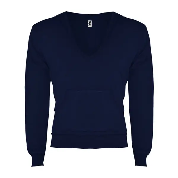 Kapucnis melegítő felső erőteljes V kivágású nyakkal, szegély azonos anyagból. Kenguru zsebbel. Eldolgozatlan varrással díszített szegély a mandzsettánál, az aljnál és a zseben.