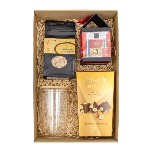 Tartalma: Lindt Nuxor Milk 165g, Zahara sós karamellás forró csoki 200g, duplafalú üveg pohár 500 ml, "Házikó tea - Esti nyugalom". Filc ajándék táskában csomagoljuk. Táska mérete: 27 x 13 x 21 cm.