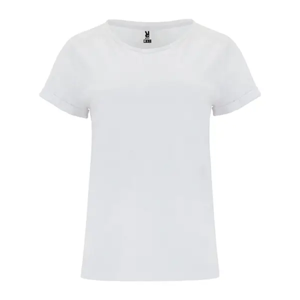 Rövid ujjú női póló. Azonos szövetű, kerek nyakrész és belül azonos árnyalatú varrásfedő. Az ujjakon négy ponton megerősített felhajtásokkal.