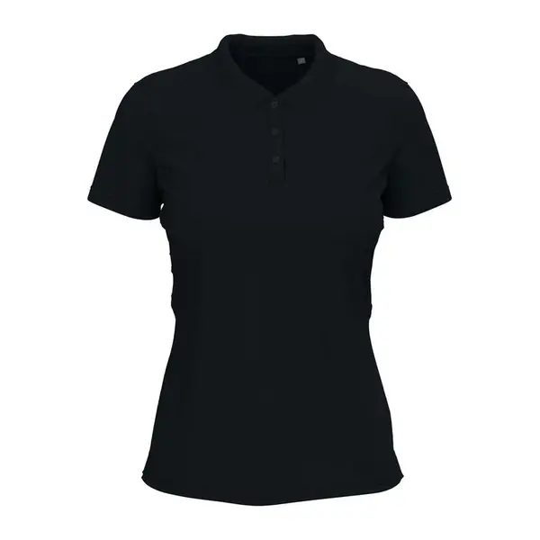 Ez a női póló szuper rugalmas, fésült pamut és elasztán keverékéből készült. Kiváló minőségű pamutpiquéja robusztus, mégis puha, goffri-szerű struktúrát hoz létre. Modern, keskeny gallér, bordás gallér és mandzsetta, 3 tónusú gomb, tónusú nyakszalag, nőies fazon, oldalvarratok résszel, prémium szőtt méretcímke a gallérban, elszakítható címke az oldalvarrásban. 95% gyűrűsfonott, fésült pamut, 5% elasztán; valódi piqué.