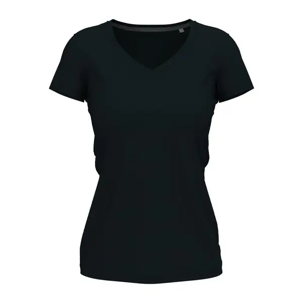 Női, V-nyakú, divatos hosszúságú póló, puha és elegáns pamut-elasztán keverékből, kontrasztos nyakszalaggal. Egyszínű jersey „full feeder”, megerősített vállvarratok, saját szövetből készült gallér, széles nyakrész, kontrasztos nyakszalag, oldalsó varratok, kis méretcímke a gallérban, ápolási címke az oldalsó varrásban. 95% gyűrűsfonott, fésült pamut, 5% elasztán; "full feeder" (GYH: 82% pamut, 14% viszkóz, 4% elasztán).