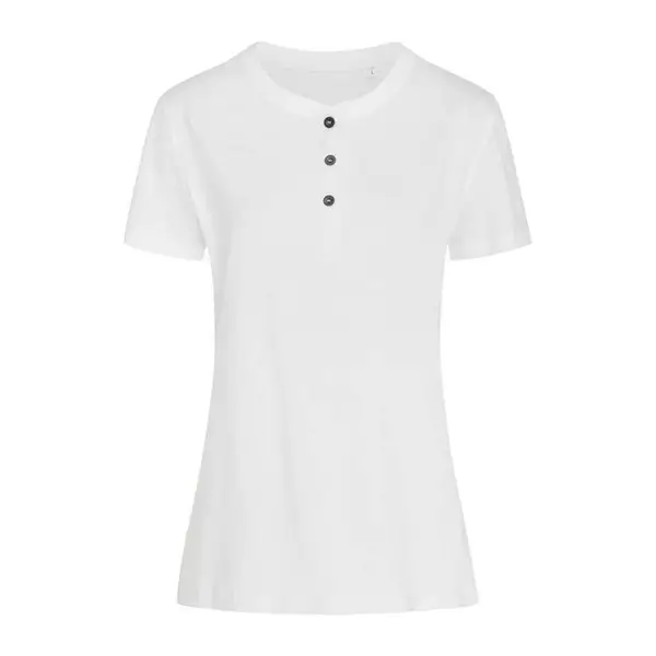Divatos Henley póló nőknek, puha szálas fonalból készült a texturált megjelenésért, keskeny, 3 gombos patenttal és cikcakkos öltésekkel a varrásokon. Szálas fonal a texturált megjelenésért, cikkcakkos öltések a varrásokon, bordás gallér, 3 fémgomb (nikkelmentes), keskeny záróvonal, nyakszalag, oldalsó varrások, kis méretű címke a gallérban, ápolási címke az oldalsó varrásban. 100% gyűrűsfonott pamut, szálas fonal; single jersey