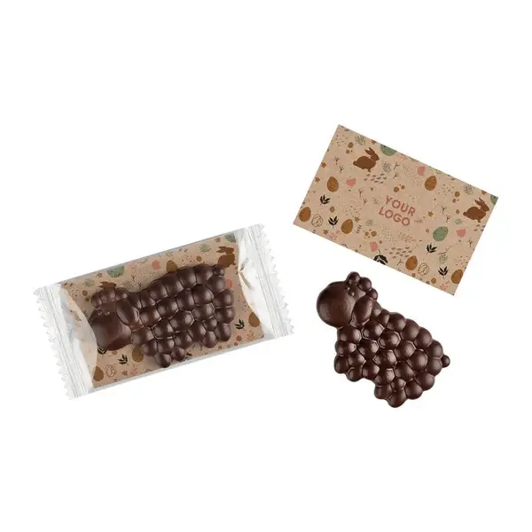 Tejcsokoládé bárány, egyedi grafikával az üdvözlőkártyán. Szállítás kb 3 hét.