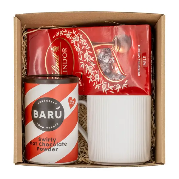 Tartalma: Lindt Lindor tejcsokoládé praliné 137 g, BARÚ Swirly Forró csokoládé por 250g, kerámia bögre bordázott mintával 400 ml. Ablakos doboz mérete 19 x 19 x 11 cm. Karácsonyi mintás papír palásttal szállítjuk. Csak 6-osával rendelhető.