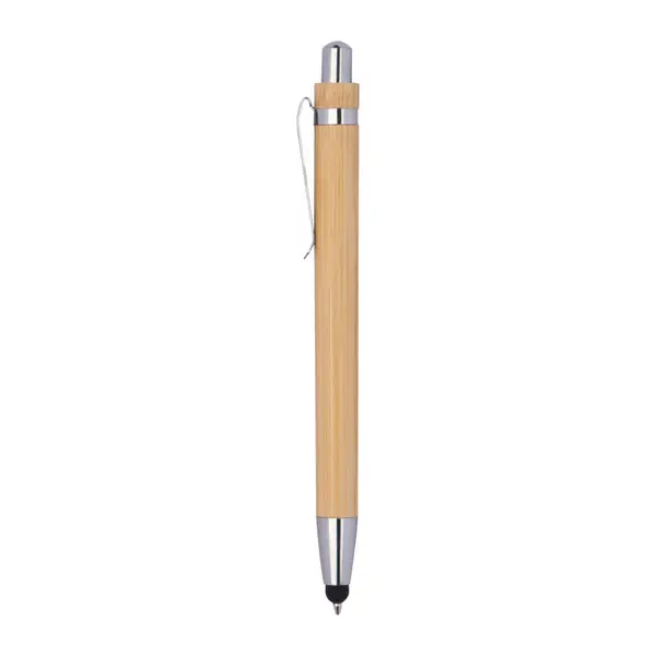 Bambusz golyótoll érintő funkcióval és ezüst színű fém kiegészítőkkel, kék tollbetéttel.