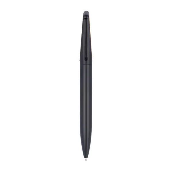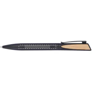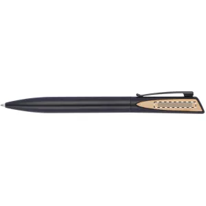 Fémből készült, matt felületű, csavaró mechanikás golyóstoll, kék tollbetéttel és mindkét oldalán bambusz díszítő elemmel.