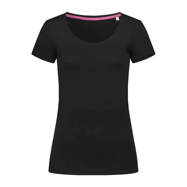 Modern női póló, divatos hosszúsággal és széles nyakkivágással, extra sima, fésült ring-spun pamutból, vékony bordás gallér, széles nyakrész, divatos rövid ujjak vékony bordás mandzsettával, kontrasztos nyakszalag, oldalsó varratok, kis méretcímke a gallérban, ápolási címke az oldalsó varrásban, 100% gyűrűsfonott, fésült pamut; single jersey (GYH: 85% pamut, 15% viszkóz).