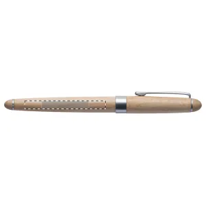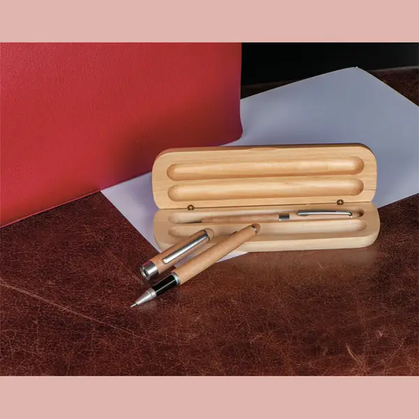 Fa tollkészlet, amely egy kék golyóstollból és egy kék roller toll-ból áll, fa tokban.