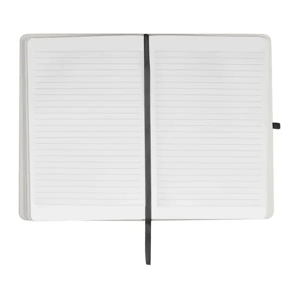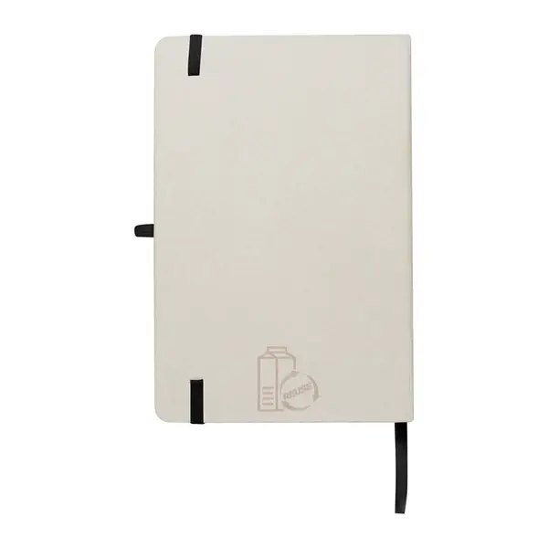 Újrahasznosított tejesdobozból készült, A5-ös méretű jegyzettömb. 160 db vonalas oldallal, fekete tolltartó hurokkal és gumis pánttal.
