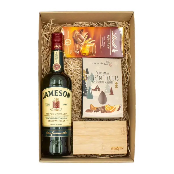 Tartalma: Jameson Whiskey 0,7L 40%, Lindt whisky-vel töltött tejcsokoládé 100g, Spicy Nuts - Chilis földimogyoró 65g, Jégkocka készlet bambuszdobozban. Ablakos dobozban szállítjuk karácsonyi mintás papírpalásttal. Doboz mérete 35x22x9 cm.