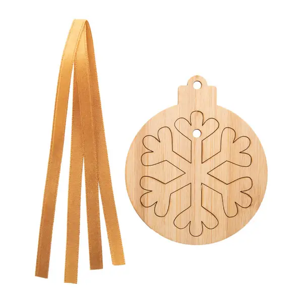 Bambusz furnérból készült 2 az 1-ben karácsonyfadísz szett arany szalagokkal. A szalagokat a dísz mellé csomagolva szállítjuk.