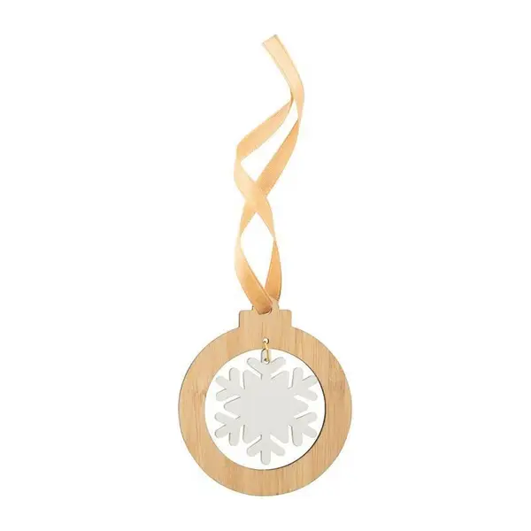 Bambusz furnér és akril karácsonyfadísz arany szalaggal. A szalagot a dísz mellé csomagolva szállítjuk.