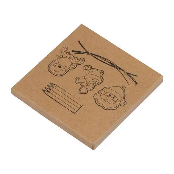 Fából készült 10 részes karácsonyi kifestőkészlet, mely tartalmaz 3 kifesthető fa figurát, hozzá tartozó zsinórokkal és 4 színesceruzát, mindez egy öko csomagolásban.