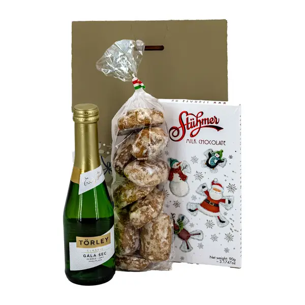 Tartalma: Törley gála sec száraz Pezsgő 0,2l , Mézespuszedli tasakban 140g, Stühmer karácsonyi táblacsoki tej 90g. Tető formájú karácsonyi díszdobozba csomagoljuk. Doboz mérete: 28x18x10 cm. Csak 24-esével vásárolható.