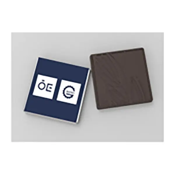 Kocka csoki ezüst fóliábn egyedileg nyomható csomagolópapírban. Méret: 30 x 30 mm