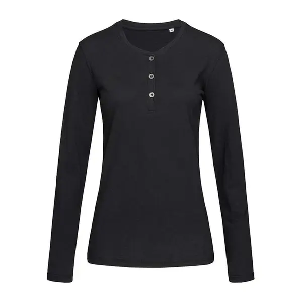 Divatos Henley hosszú ujjú női pulóver, puha szálas fonalból készült a texturált megjelenésért. Keskeny, 3 gombos patenttal és cikcakkos öltésekkel a varrásokon. Szálas fonal a texturált megjelenésért, cikkcakkos öltések a varrásokon, bordás gallér, 3 fémgomb (nikkelmentes), keskeny záróvonal, nyakszalag, oldalsó varrások, kis méretű címke a gallérban, ápolási címke az oldalsó varrásban. 100% gyűrűsfonott pamut, slub fonal; single jersey