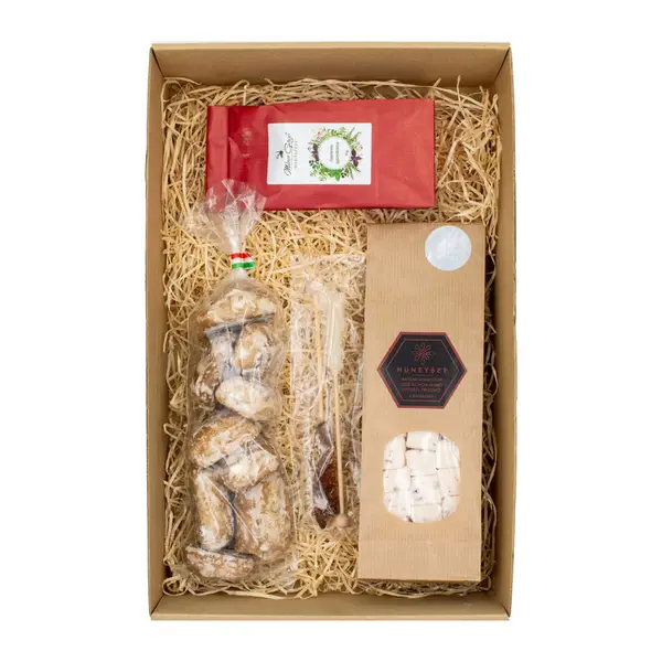Tartalma: Eperkrém gyümölcs tea 90g, Pilleméz tasakban- természetes méz alternatíva, Mézespuszedli vaníliás 140g, 2 db kandis pálca. Ablakos dobozban szállítjuk karácsonyi mintás papírpalásttal. Doboz mérete 35x22x9 cm.