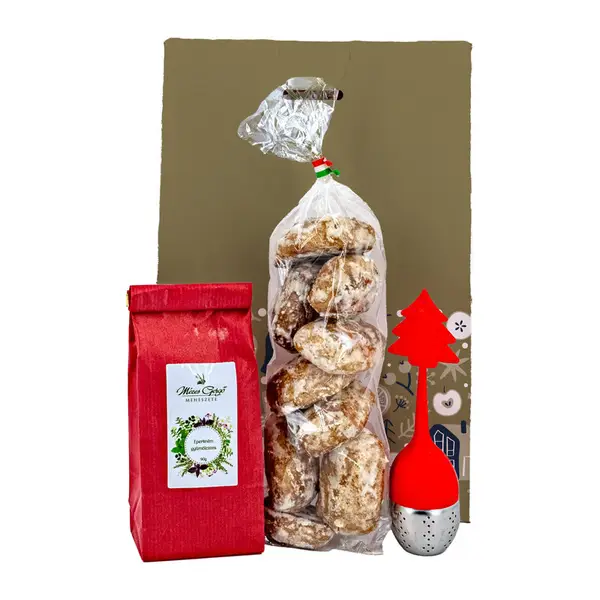 Tartalma: Teatojás, Mézespuszedli vaníliás-kakaós válogatás 140g, Eperkrém gyümölcstea 90g, Tető formájú karácsonyi díszdobozba csomagoljuk. Doboz mérete: 28x18x10 cm.