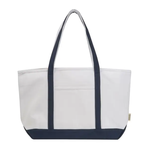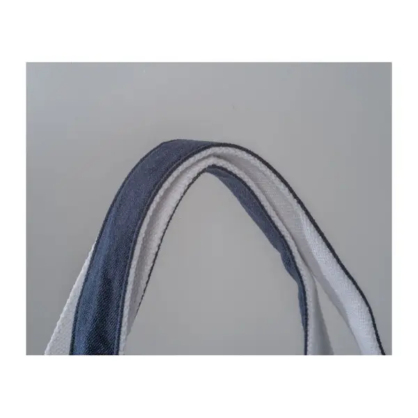 Nagy méretű táska újrahasznosított pamutból (730 g/m²), színes hosszú füllel, zsebekkel és stabil aljzattal. Bevásárlótáskaként vagy strandtáskaként is használható.