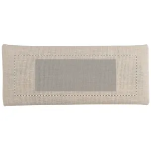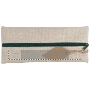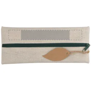 Írószer tolltartó tartalma: vonalzó, radír, hegyező, ceruza és golyóstoll. Környezetbarát pamut csomagolásban, gumi zárószalaggal és levél formájú etikettel a logó számára.