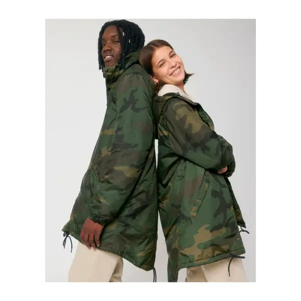 Elegáns uniszex kabát fém patentokkal, ferde zsebekkel és dupla rétegű kapucnival. A belső rész gyémántmintás steppelése és az állítható húzózsinórok garantálják a tökéletes illeszkedést.