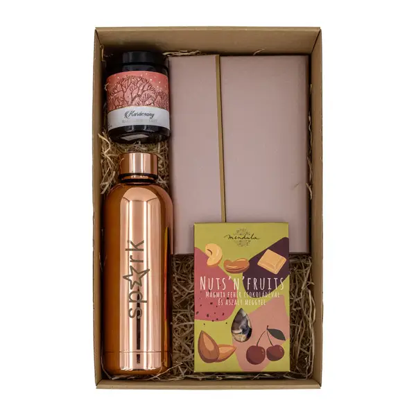 Tartalma: Dupla falú vákuumos rozsdamentes acél termosz 500 ml, A5 vonalas jegyzetfüzet és színben hozzá illő golyóstoll szett, Karácsony szálas tea üvegben 50g, Magkeverék csokoládéval és aszalt meggyel 150 g. Ablakos dobozban szállítjuk karácsonyi mintás papírpalásttal. Doboz mérete 35x22x9 cm.