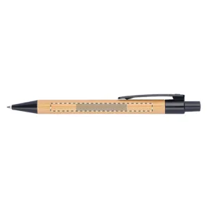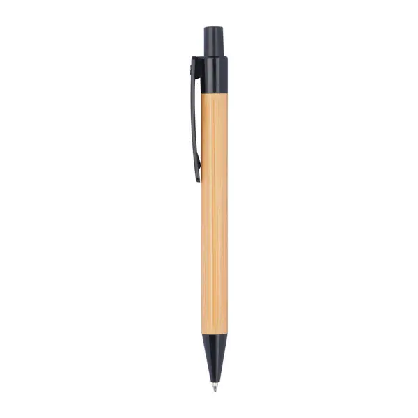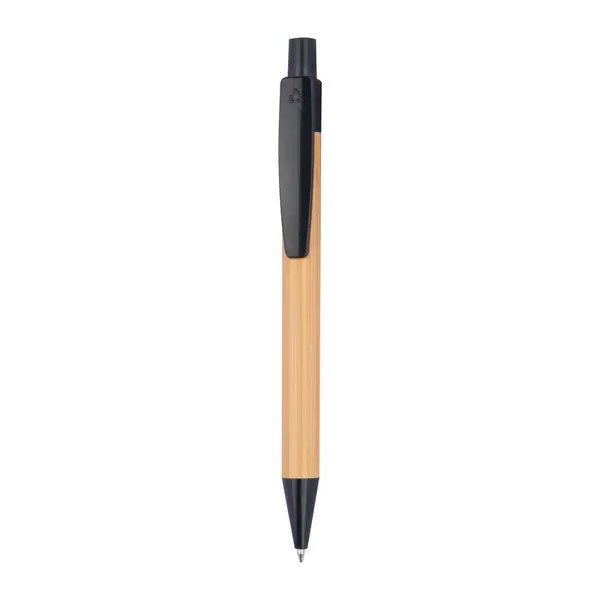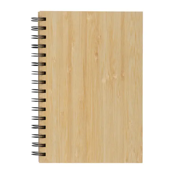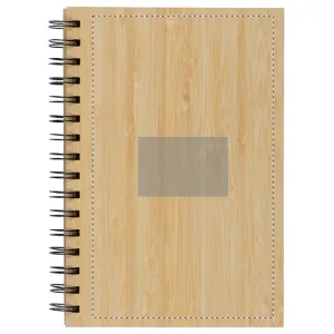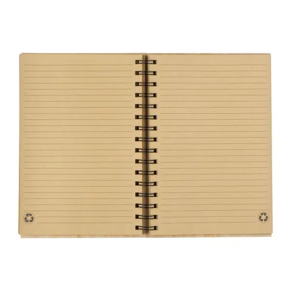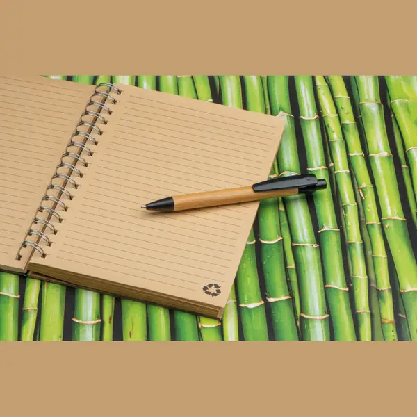 Elegáns jegyzetkészlet, amely egy bambusz borítós spirálkötésű és 160 újrahasznosított papírból készült vonalas oldalú A5-ös jegyzetfüzetből, valamint egy bambusz golyóstollból áll, kék műanyag íróbetéttel és műanyag kiegészítőkkel.
