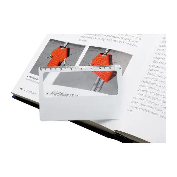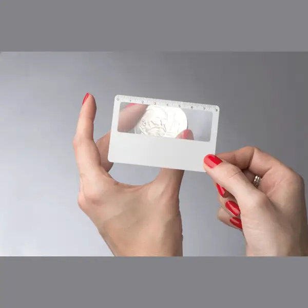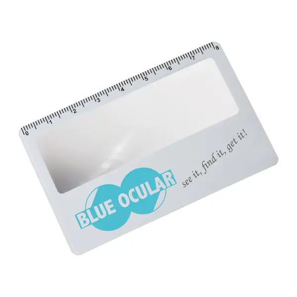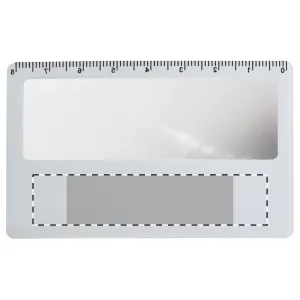 Műanyag bankkártya méretű nagyító, fehér színben, vonalzó felfestéssel ellátva.