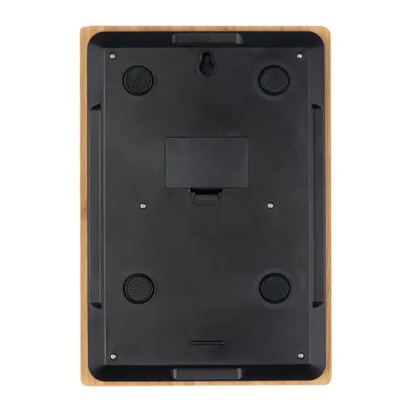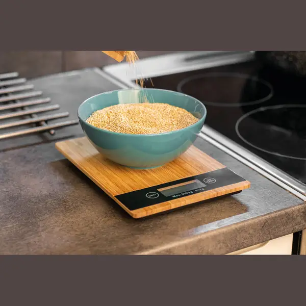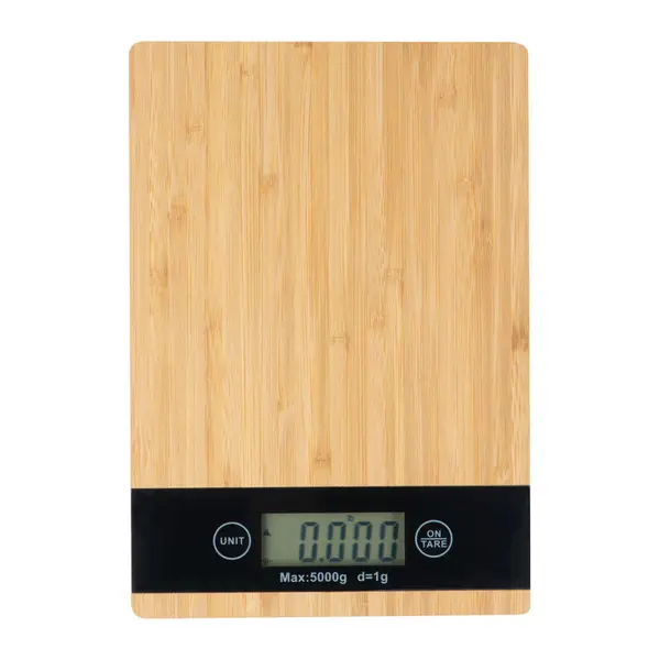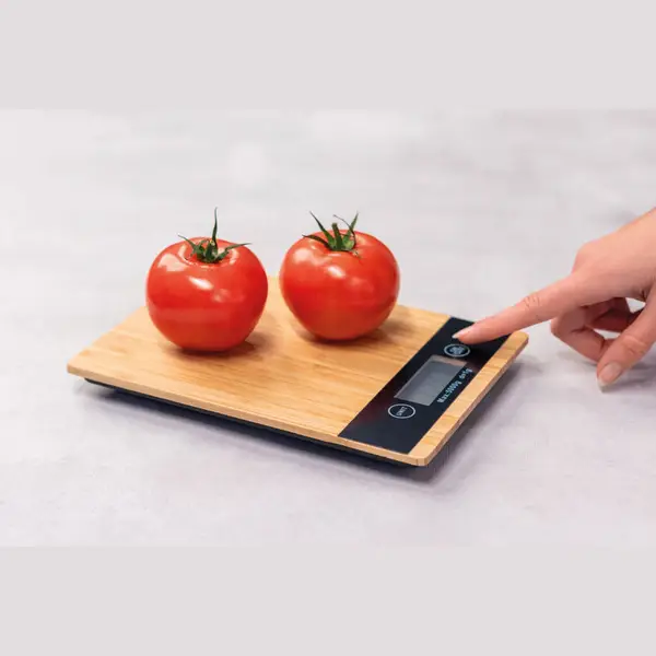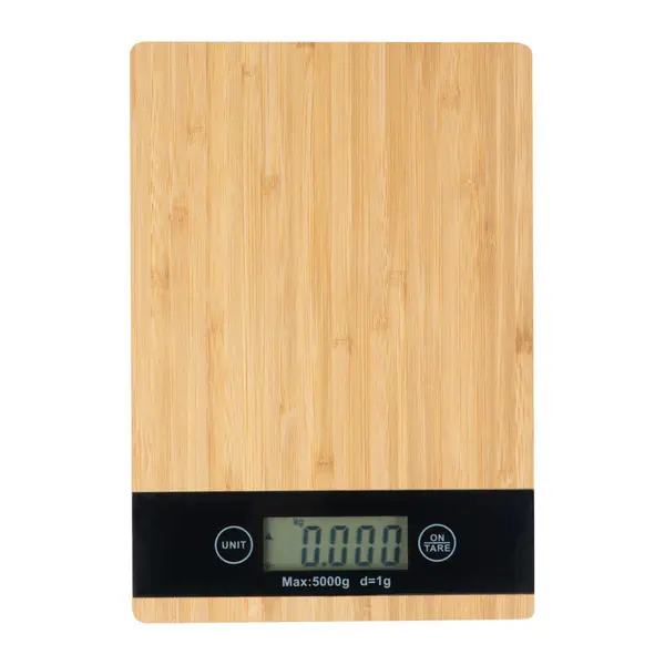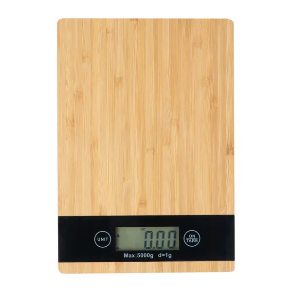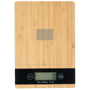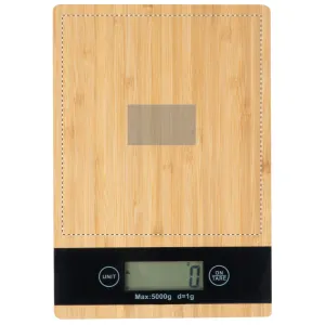 Digitális bambusz konyhamérleg fekete kijelzővel. A maximális teherbírás 5 kg. Mértékegységek kg / g / oz / ml-ben jeleníthetők meg, legfeljebb 1 g-ig.
