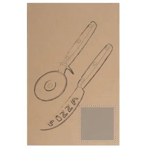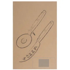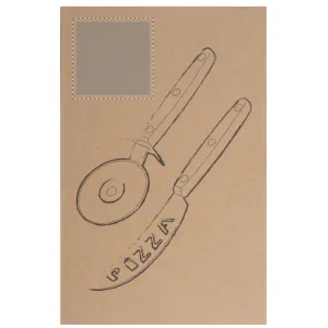 2 darabos pizza készlet, amely egy pizzavágóból és egy késből áll, mindkettő műanyag fogantyúval és rozsdamentes acél vágóéllel. A környezetbarát csomagoláson belül egy finom pizza recept található.