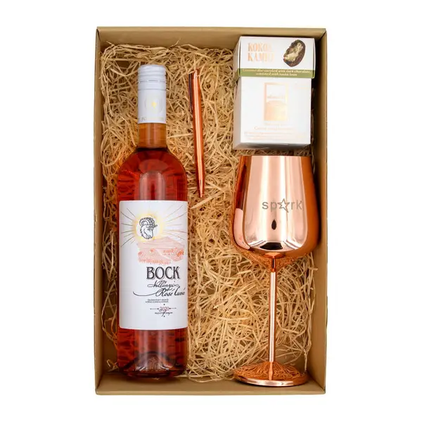 Tartalma: ChocoMe Raffinée - Kokoa Kamili kakaóbabból készült étcsokoládéval bevont kókuszkorong tonkababbal fűszerezve 100g, Bock Villányi Rosé bor 2024, Nyomógombos alumínium golyóstoll, Rozsdamentes acélból készült borospohár réz bevonattal, 500 ml. Ablakos dobozban szállítjuk karácsonyi mintás papírpalásttal. Nagy Ablakos doboz mérete 35x22x9 cm.