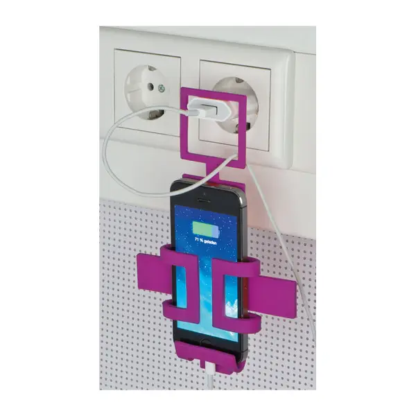 Univerzális mobiltelefon tartó, hajlékony fém vázzal, amelyet szilikon borítás véd. Töltés közben a konnektorhoz rögzíthető, és az emblémázás akkor is látható, ha a mobiltelefon a tartóban van.