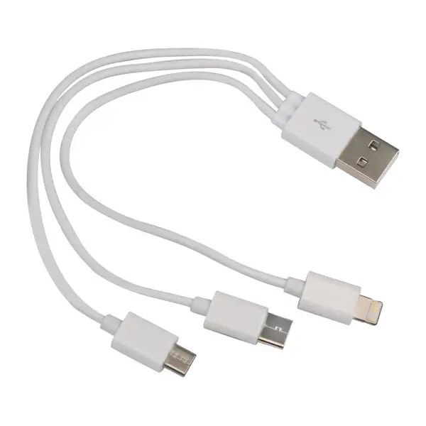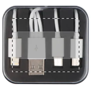 3 az 1-ben USB töltő és adatkábel szett mely tartalmaz USB-C, mikro USB és Lightning iOS csatlakozókat műanyag dobozban.