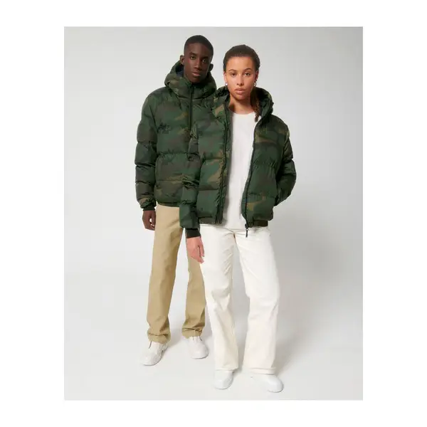 Elegáns AOP pufi dzseki bélelt kapucnival, állítható funkciókkal és hordozópántokkal. Több cipzáras zsebbel és állvédővel rendelkezik. Kényelemes és praktikus.