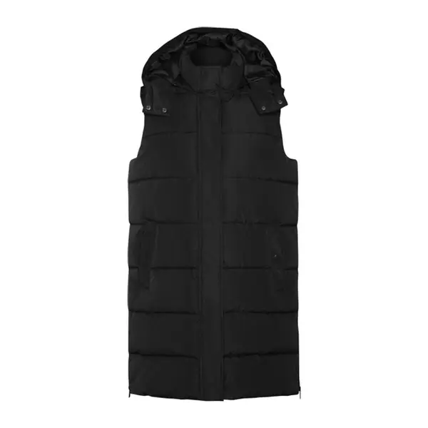 Női bélelt mellény levehető kapucnival. Magas gallér. Elülső cipzár szélfogóval elrejtve.Két zseb patent gombos zárással.Oldalsó nyílások cipzárral.Belső mellrészen hozzáférés újrafeldolgozáshoz
