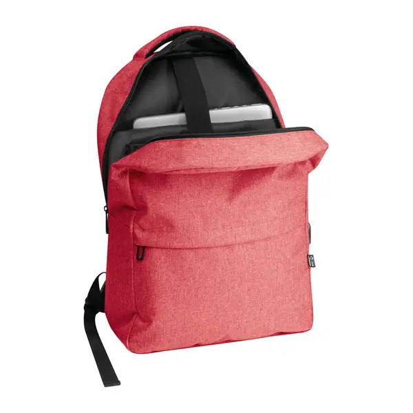 RPET hátizsák USB csatlakozóval, párnázott laptop rekesszel, elülső zsebbel és lopás biztos rekesszel, párnázott vállpántokkal.