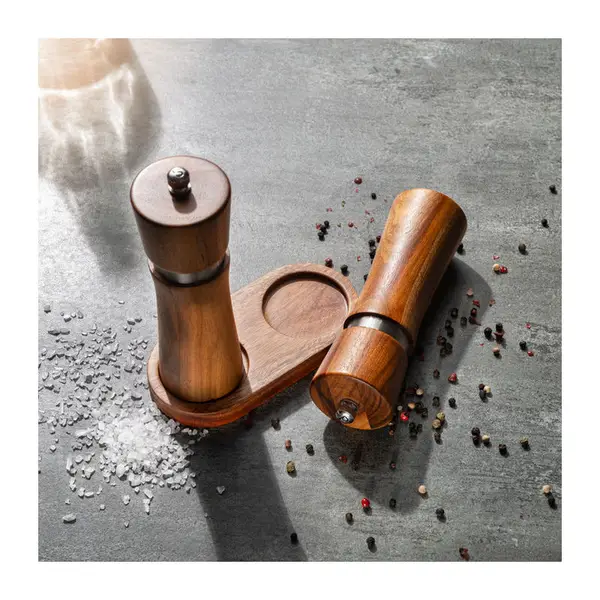 Vanilla Season elegáns só- és borsőrlő készlet állvánnyal. A darálók akácfából készültek, rozsdamentes acél tartozékkal. Az őrlőkövek kerámiából készültek. Ajándékdobozba csomagolva.