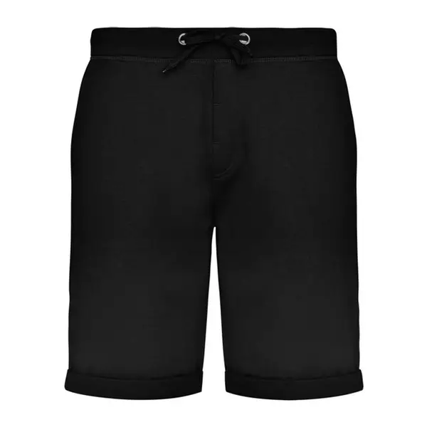 Rövid sportnadrág, elasztikus, széles derékpánttal, behúzható fűzővel. Díszcipzárral díszítve. Oldalzsebek, farzseb, és felhajtott alj, biztonsági díszvarrással.