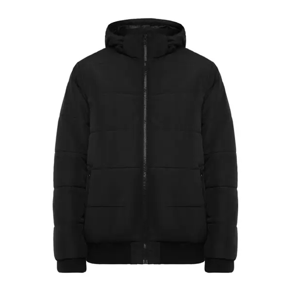 Vízlepergető bélelt dzseki. Magas gallér. Összehajtható, állítható kapucni. Elülső cipzár hozzáillő állvédővel. Két oldalzseb cipzárral. 2x1 bordázott szövet mandzsettáknál és a derékrészen. Hozzáférés az újrahasznosításhoz a bal mellkasnál és a háton.