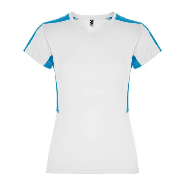 Rövid ujjú, női technikai póló.1.- V nyak.2.- Hátul és oldalt két poliészterből kombinált kialakítás. 3.- Bird's eye fő szövettel és hálós 3D lélegző szövettel a vállakon és az oldalsó betéteken. 4.- A nedvesség felszívására kialakított szövet.