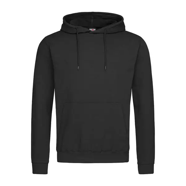 Tartós, közepes vastagságú férfi kapucnis pulóver gyűrűs fonású pamut-poliészter keverékből. Belseje bolyhos, tónusos zsinórral, kenguruzsebbel, rugalmas mandzsettával és derékrésszel, halszálkás nyakszalaggal, oldalsó varrásokkal rendelkezik. Méret- és ápolási címke a gallérban. Anyaga 80% pamut, 20% poliészter (GYH: 70% pamut, 20% poliészter, 10% viszkóz).