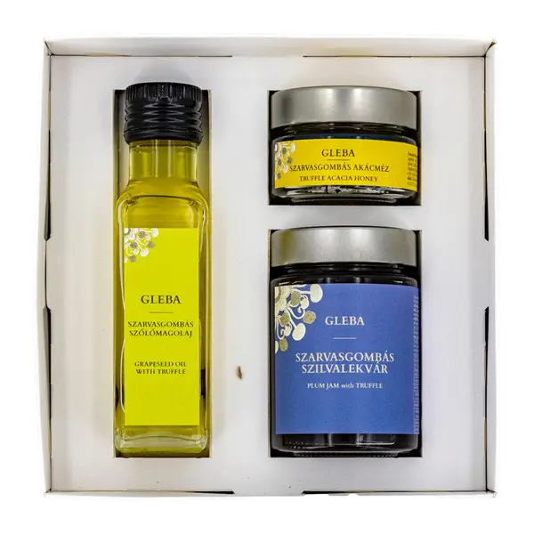 Tartalma: szarvasgombás szilvalekvár 200 g, Szarvasgombás szőlőmagolaj 100g, Szarvasgombás akácméz 60g.