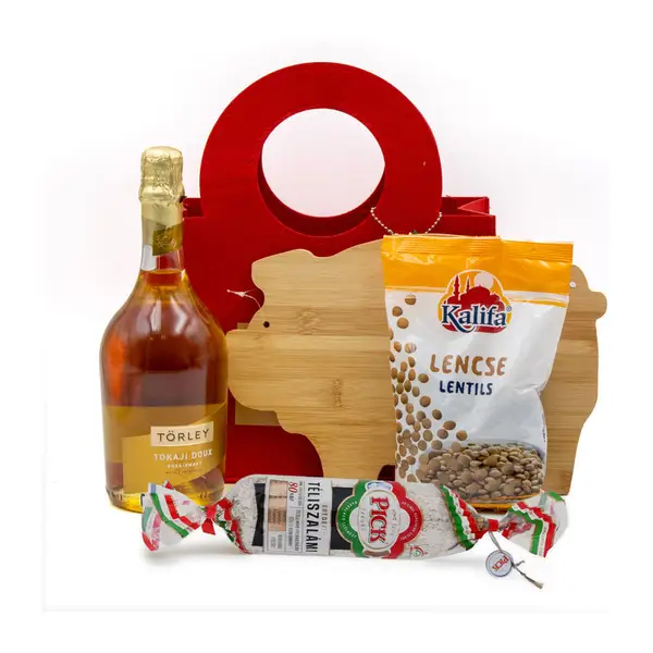 Tartalma: Malac alakú bambusz vágódeszka 30x20x1 cm, Törley Tokaji doux pezsgő 0,75l , Pick téliszalámi rúd 400g, lencse 500g. Filc ajándék táskában szállítjuk, táska mérete: 27 × 13 × 21 cm.