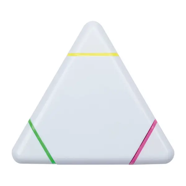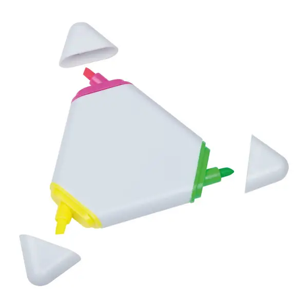 Háromszög alakú szövegkiemelő újrahasznosított műanyagból, sárga, zöld és rózsaszín színben.